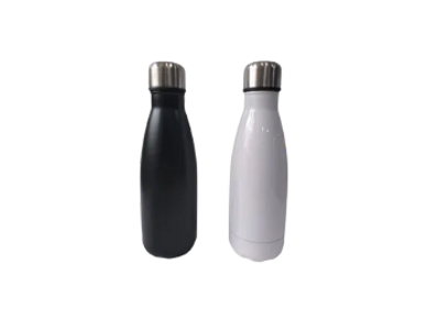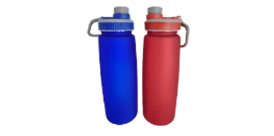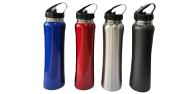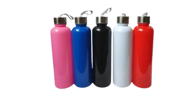 Descripción: Interior de metal, por fuera cuerpo de metal con recubrimiento en el medio de acrílico traslúcido de color (ver colores disponibles), asa y tapa de plástico negro. Capacidad: 450 ml. (Aprox.) Colores: Azul y rojo.