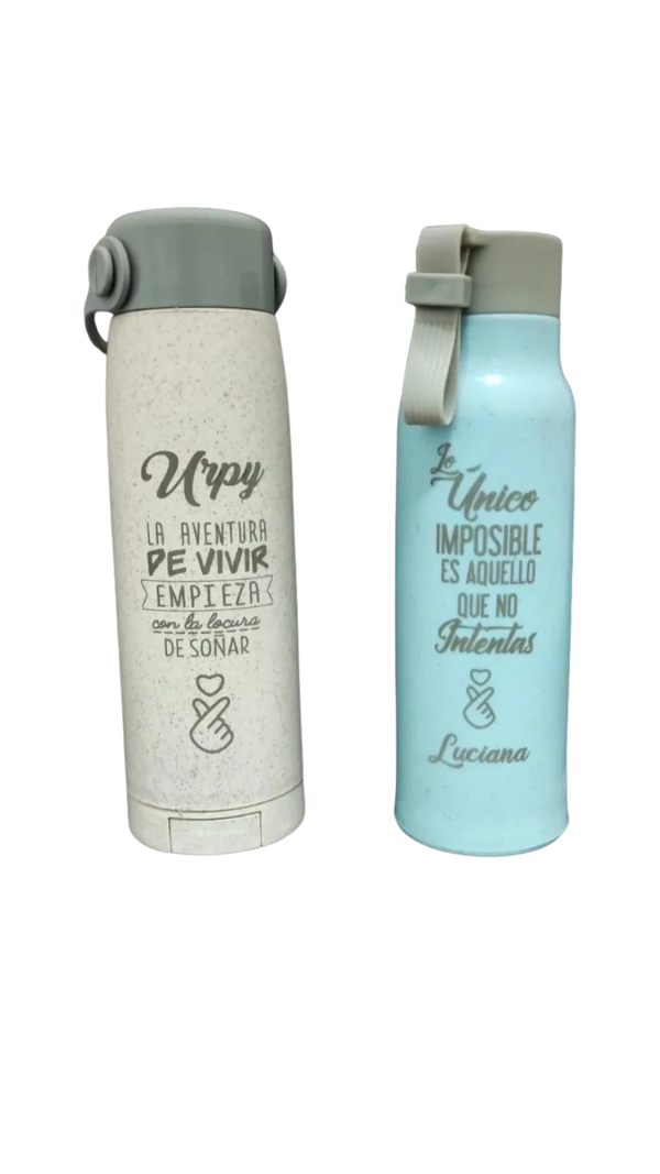 Medidas: Altura: 20.5 cm. Diámetro: 6.5 cm. (Aprox.) / Descripción: Totalmente metálico con tapa de plástico negro y sujetador clip de metal del color del Tomatodo / Capacidad: 500 ml. (Aprox.)..